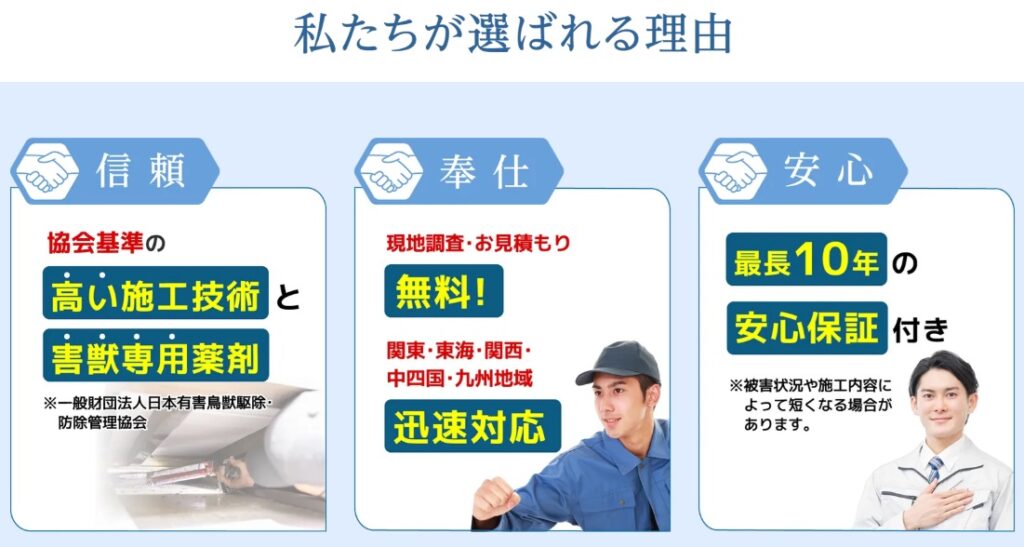駆除作業を外部の下請け業者に委託するのではなく、自社スタッフが一貫して対応する業者は、施工品質の管理がしやすい傾向があります。
